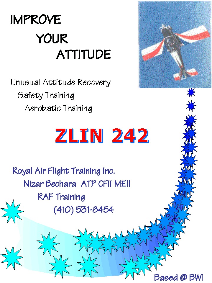 Improve your safety skills. Recover from unusual attitudes and upsets. Learn to loop and roll your way through the sky in our fully aerobatic Zlin 242 with inverted fuel & oil system. Based at Signature Flight Support at Baltimore Washington International Airport |
